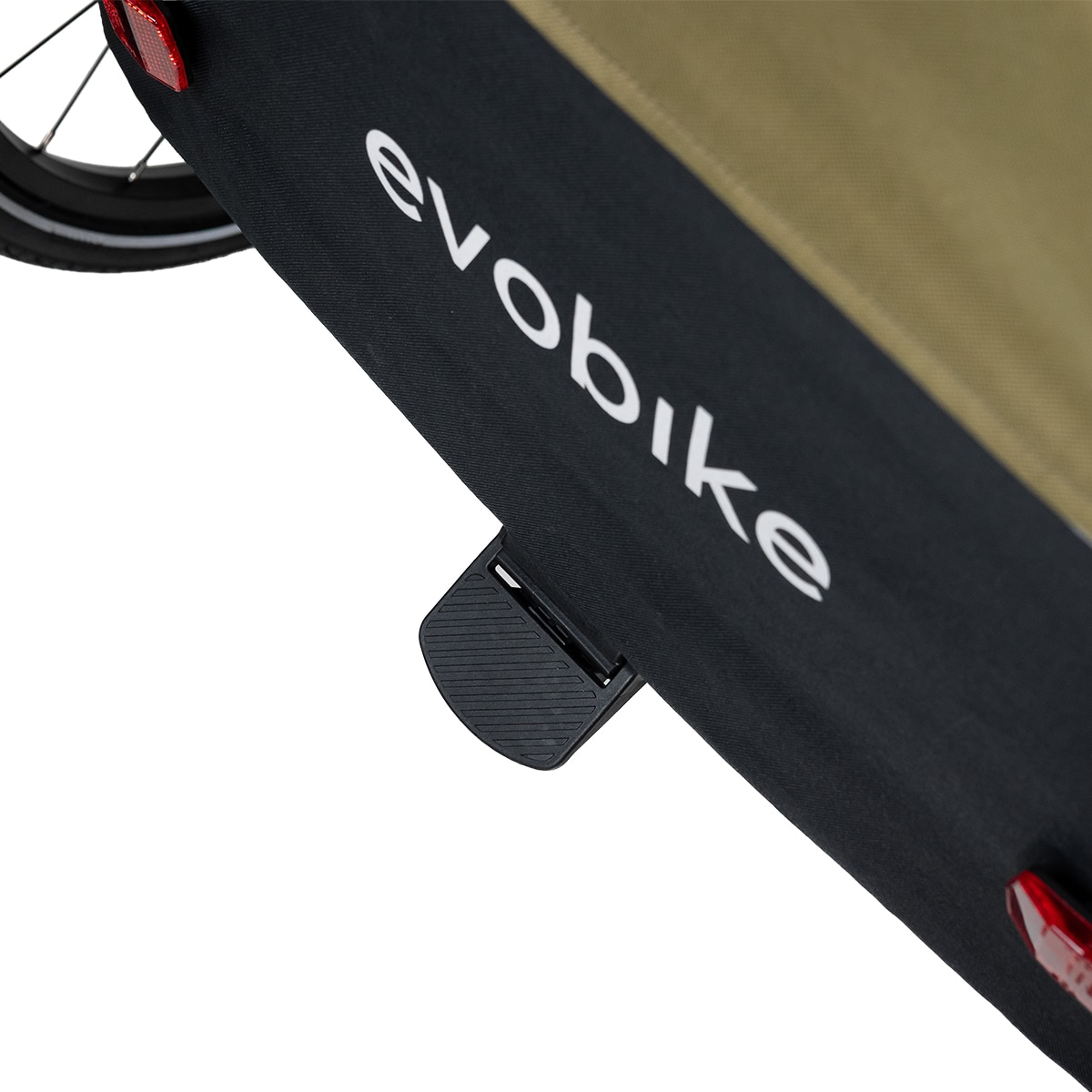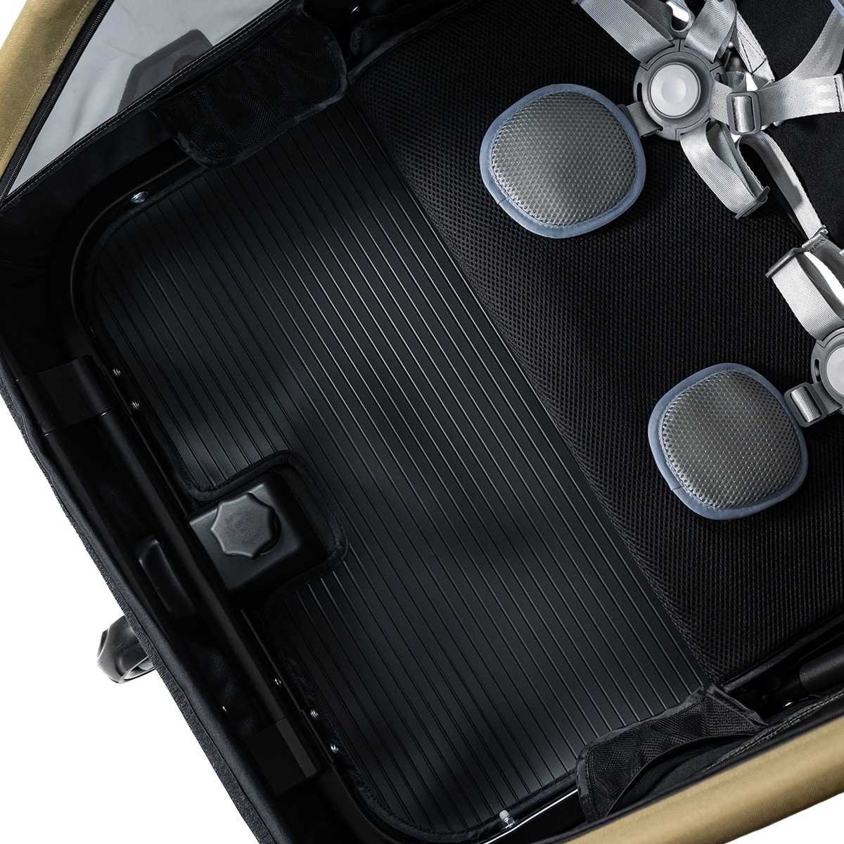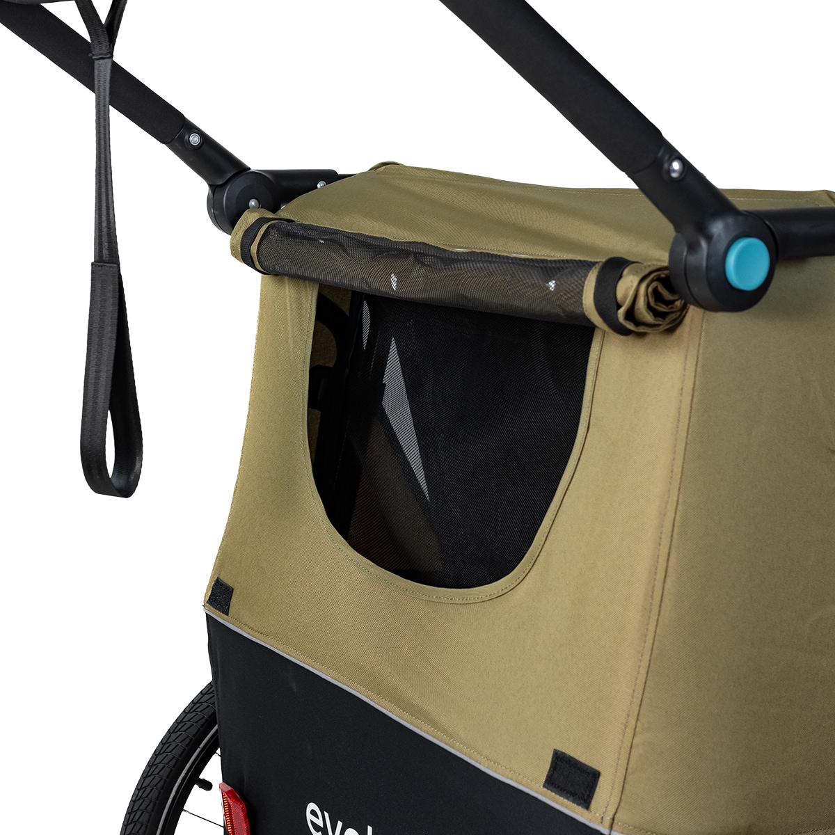 Lisäkäytännöllisyyttä tuo pyöräkärryn takaosan säilytystila, joka sopii esimerkiksi laukulle tai muille tarvikkeille.