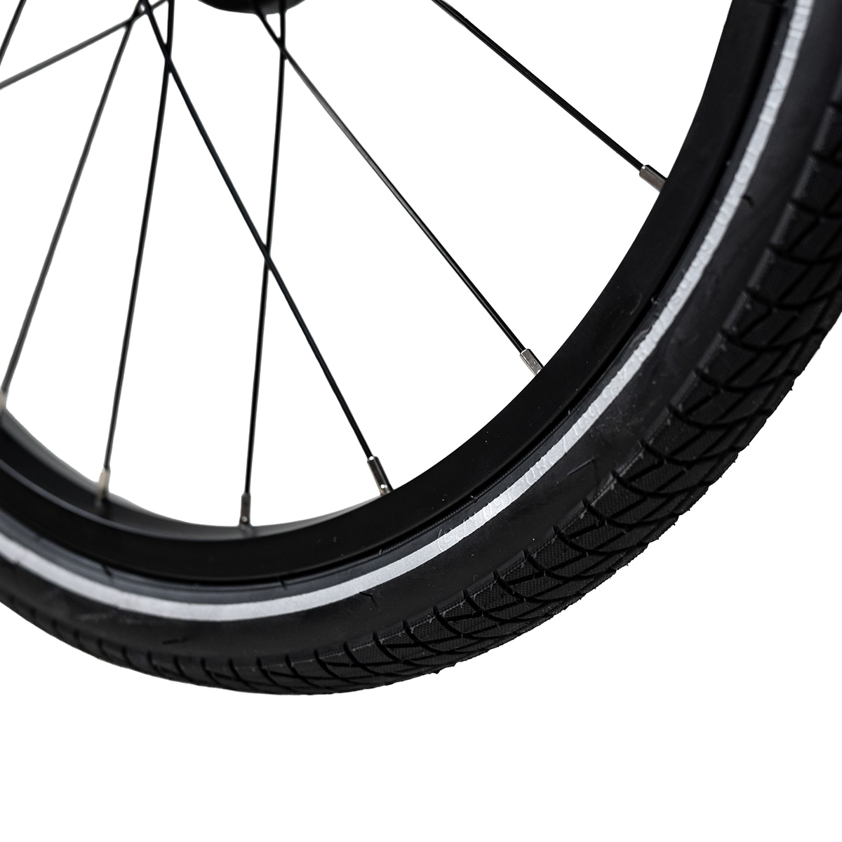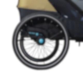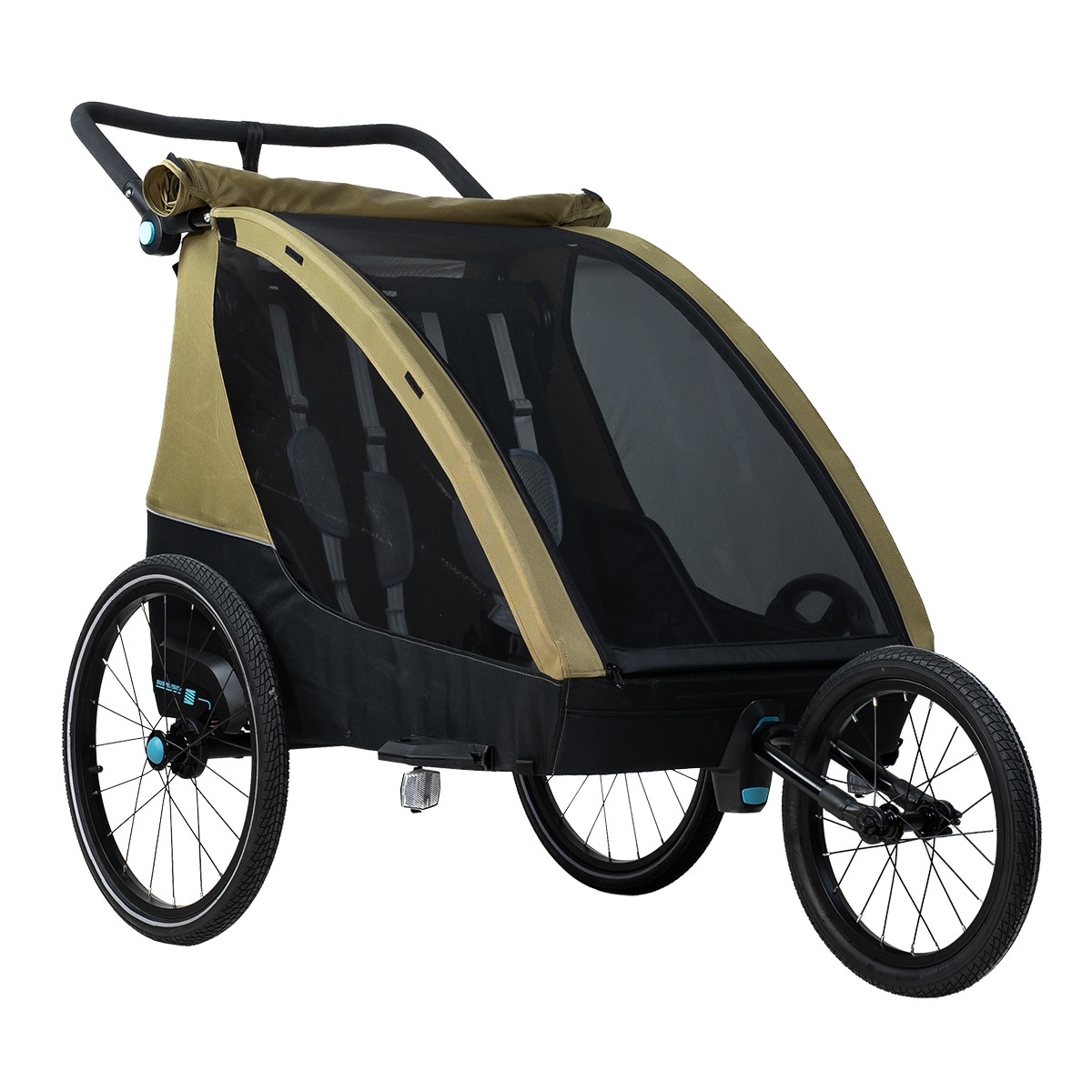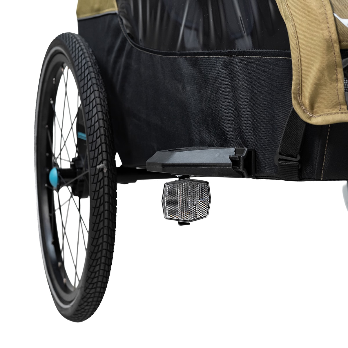 Lisäturvallisuutta tuovat heijastimet, renkaiden heijastinnauhat sekä lippu, jotka parantavat näkyvyyttä liikenteessä. Pysäköintijarru lisää vakautta vaunun ollessa paikallaan, ja kun vaunua ei käytetä, se voidaan helposti taittaa kokoon kompaktiksi säilytystä tai autokuljetusta varten.