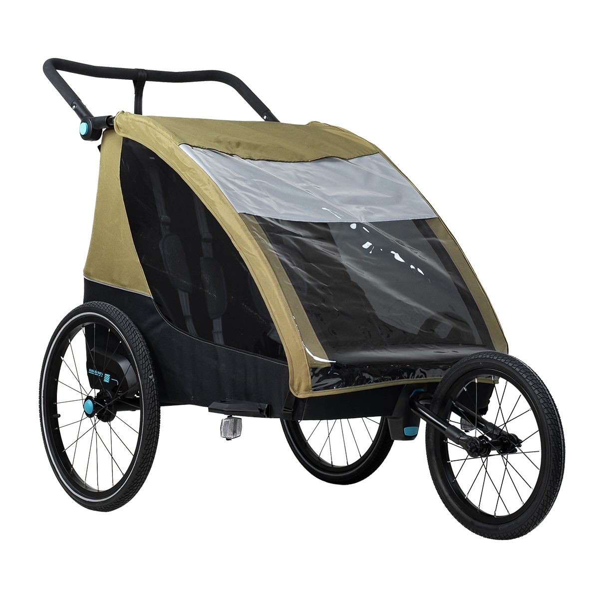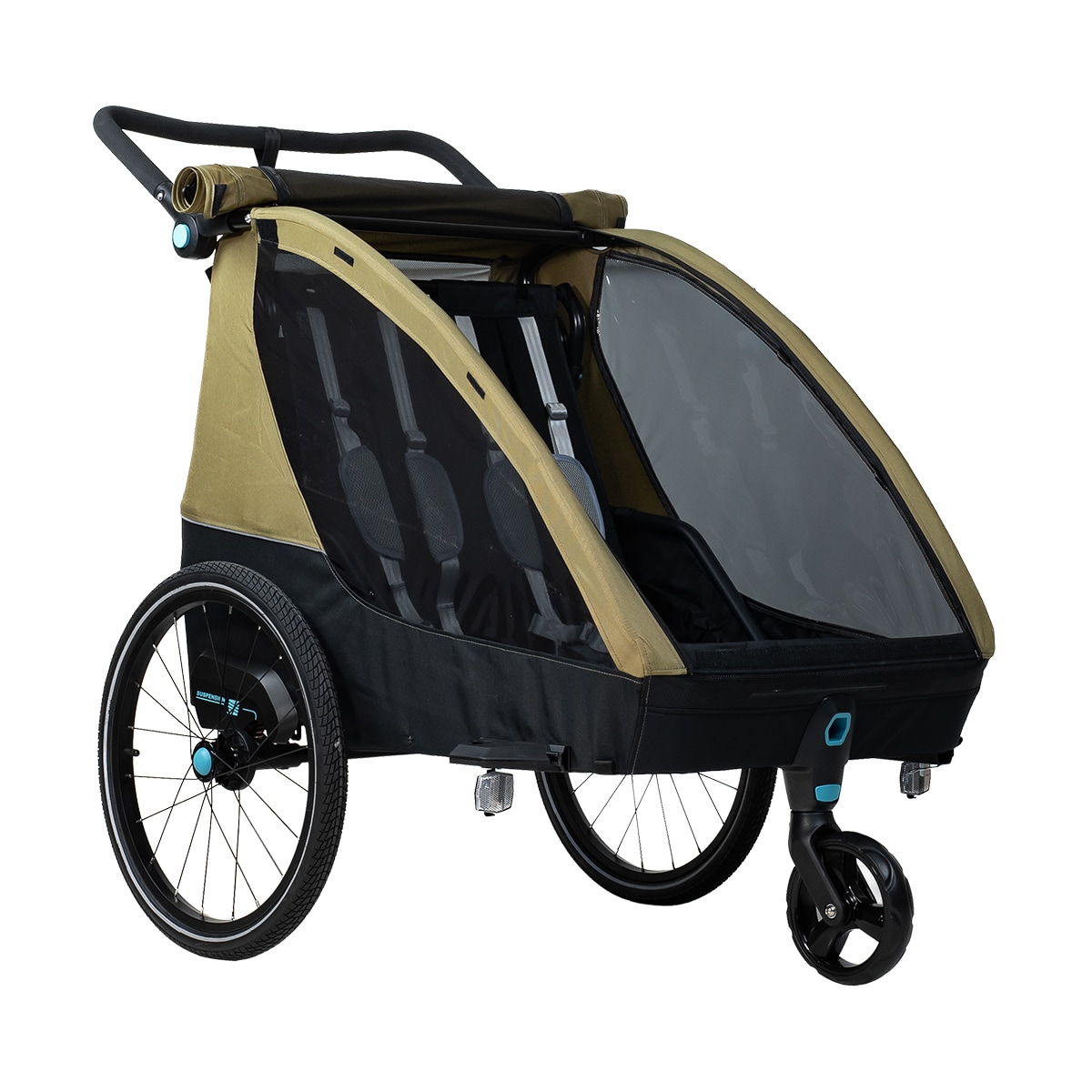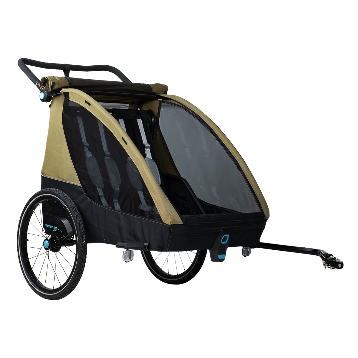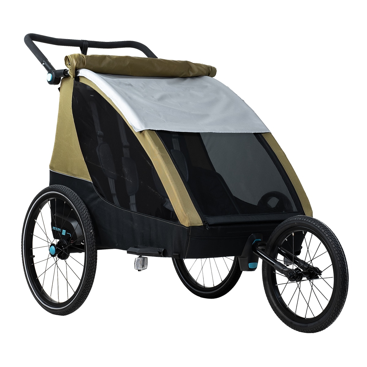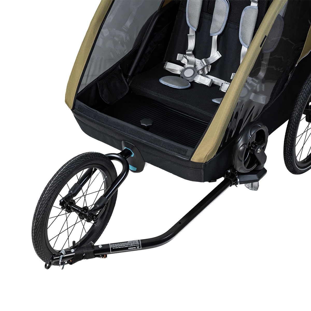 Evobike Sandhamn Duo on suunniteltu toimimaan pyöräkärrynä, lastenvaununa ja kävelyvaununa, mikä tekee siitä joustavan valinnan kahden lapsen perheille. Juoksupyörät ja kävelyvaunun pyörät sisältyvät, joten vaunu voidaan helposti mukauttaa eri aktiviteetteihin ja alustoihin. Vauvan valjaat ovat myös saatavilla lisävarusteena, jos haluat käyttää vaunua pienempien lasten kanssa.
