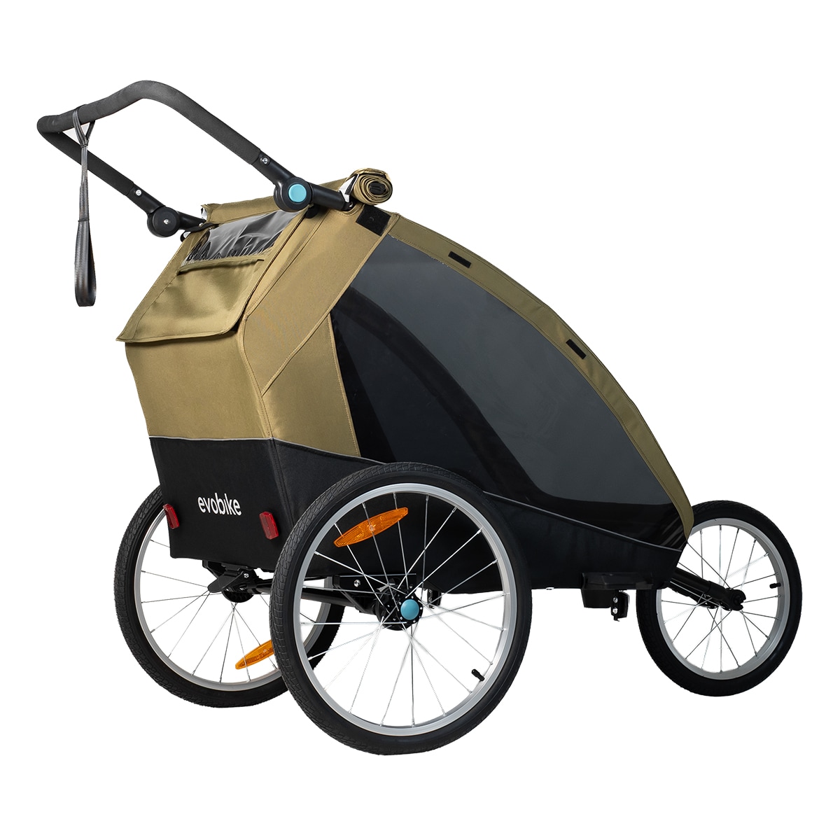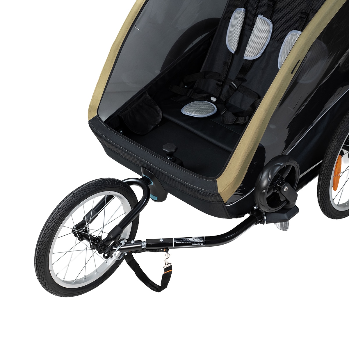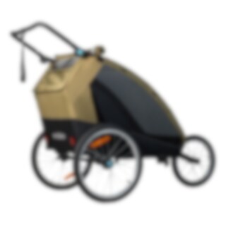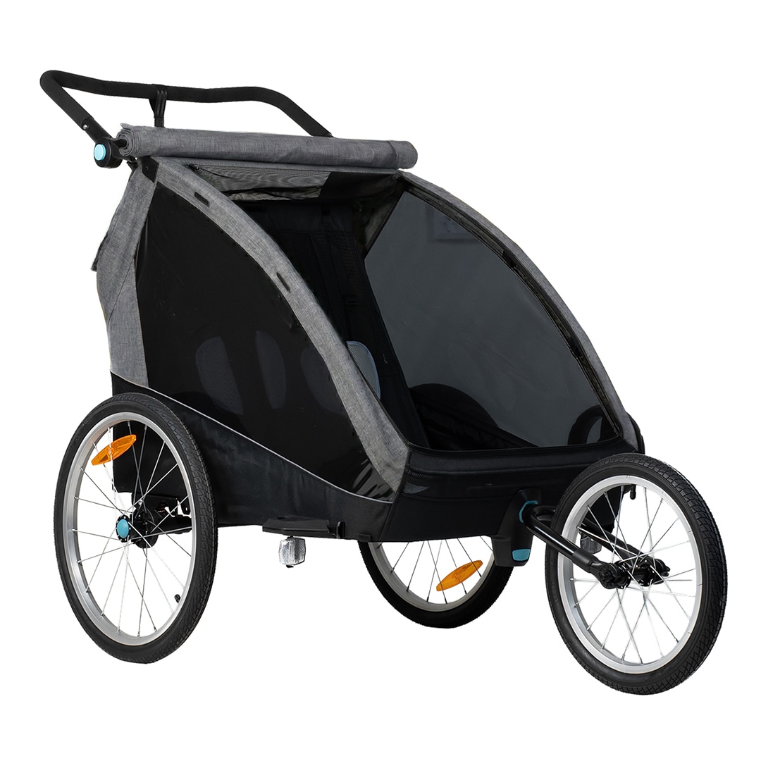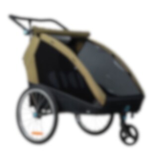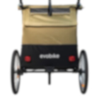 Evobike Tjörn Duo on suunniteltu toimimaan pyöräkärrynä, lastenvaununa ja kävelyvaununa. Juoksupyörät ja kävelyvaunun pyörät sisältyvät, mikä tekee vaunusta joustavan vaihtoehdon kahden lapsen perheille. Vauvan valjaat ovat myös saatavilla lisävarusteena, jos haluat käyttää vaunua pienempien lasten kanssa.