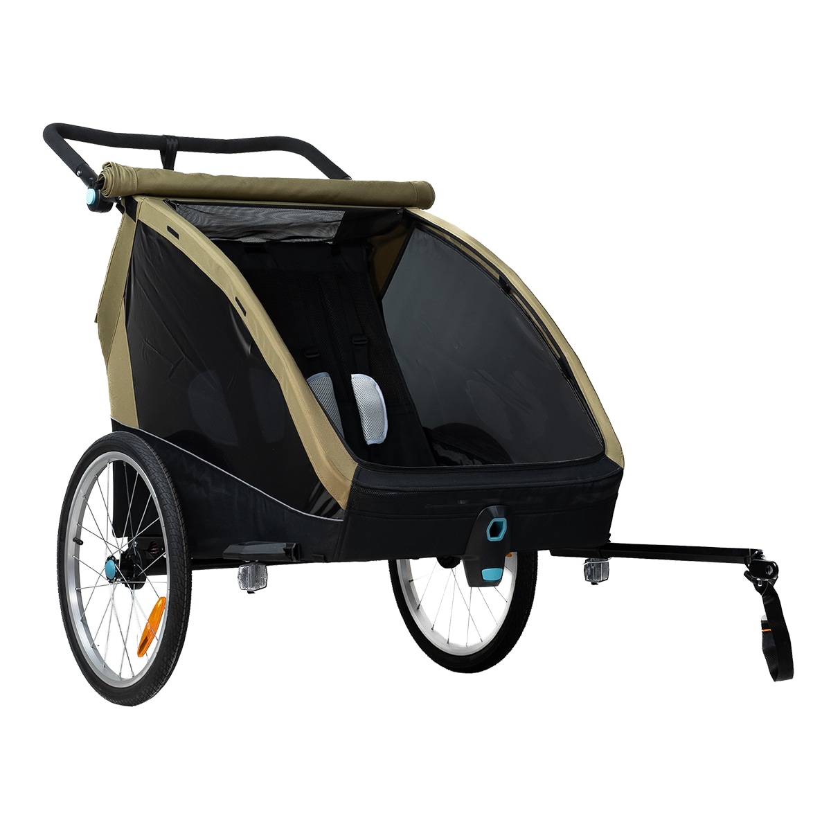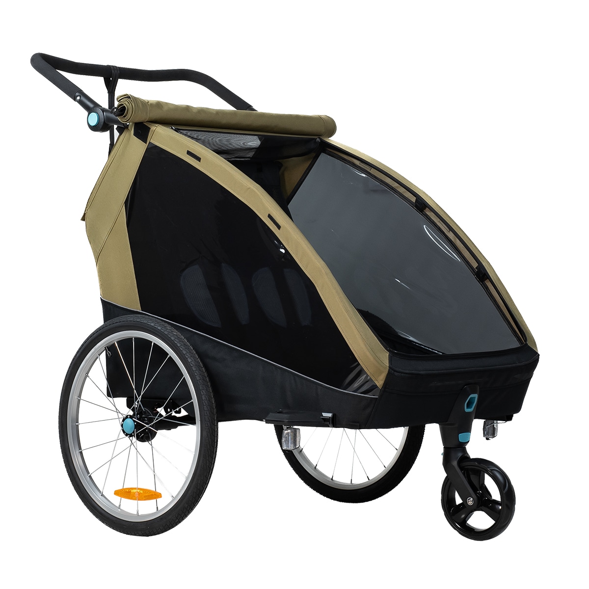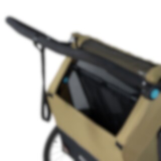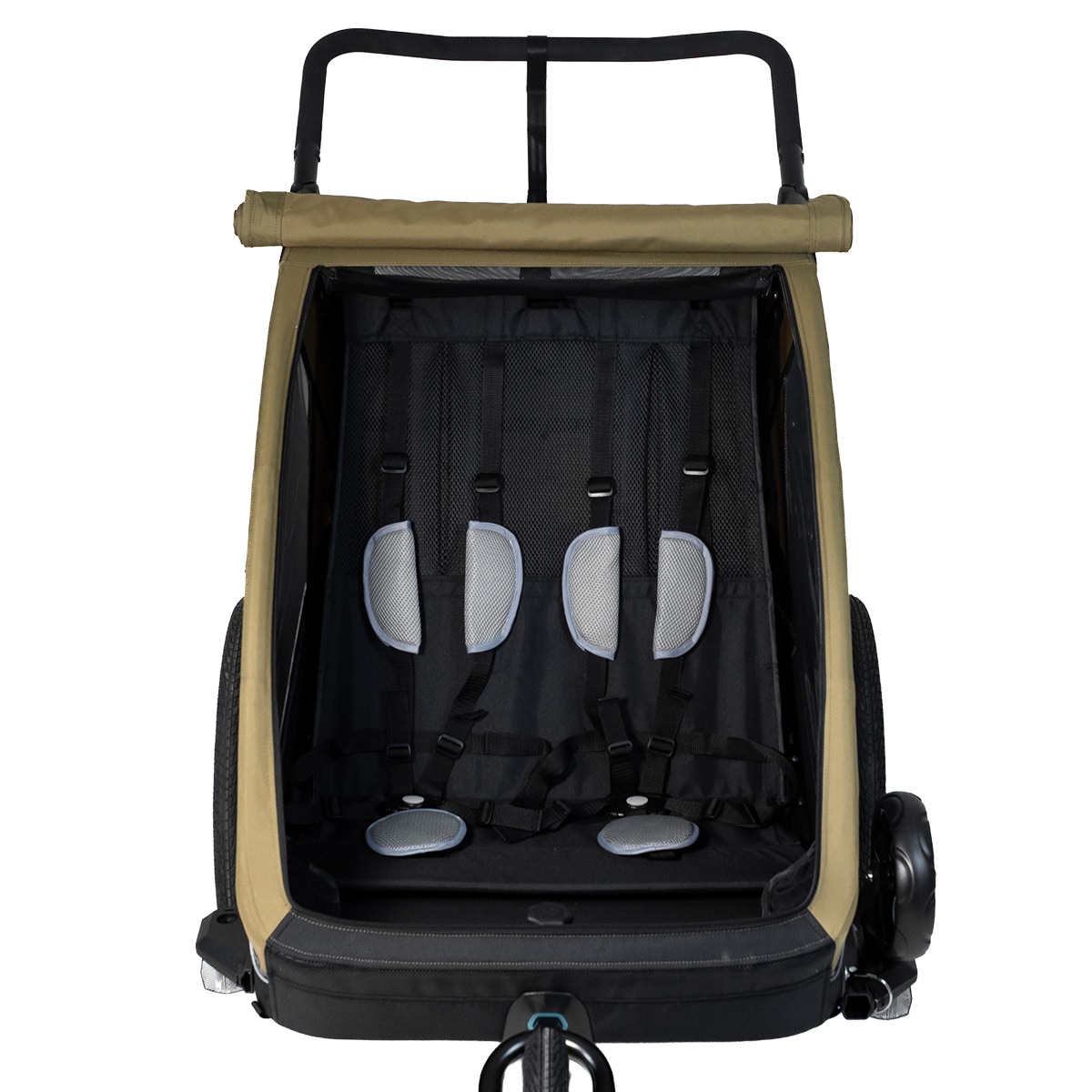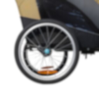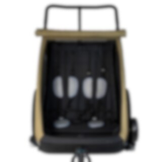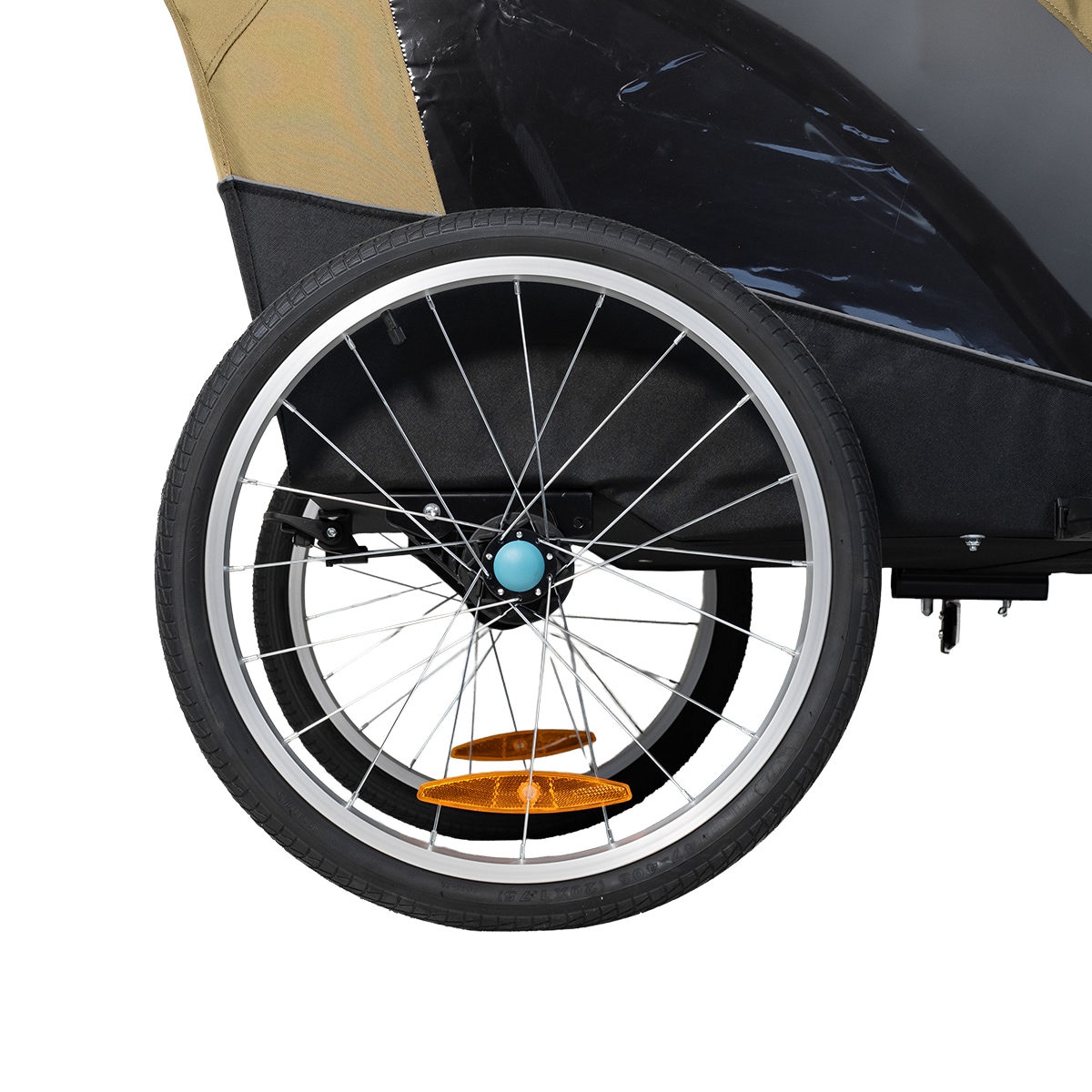 Pyöräkärryssä on runsaasti tilaa kahdelle lapselle, ja se on valmistettu kestävästä 600D Oxford-kankaasta, jonka vesipilari on 5000 mm. Se kestää sadetta ja soveltuu päivittäiseen käyttöön, mutta saumoja ei ole teipattu. Mukana tulee integroitu kaksiosainen tuuli- ja aurinkosuoja, joka voidaan helposti avata aukon päälle. Tuulisuoja on luonnollisesti vettä hylkivä, jos tulee sadekuuro. Harkittu muotoilu luo suojaisan ja mukavan istuinympäristön matkan aikana.