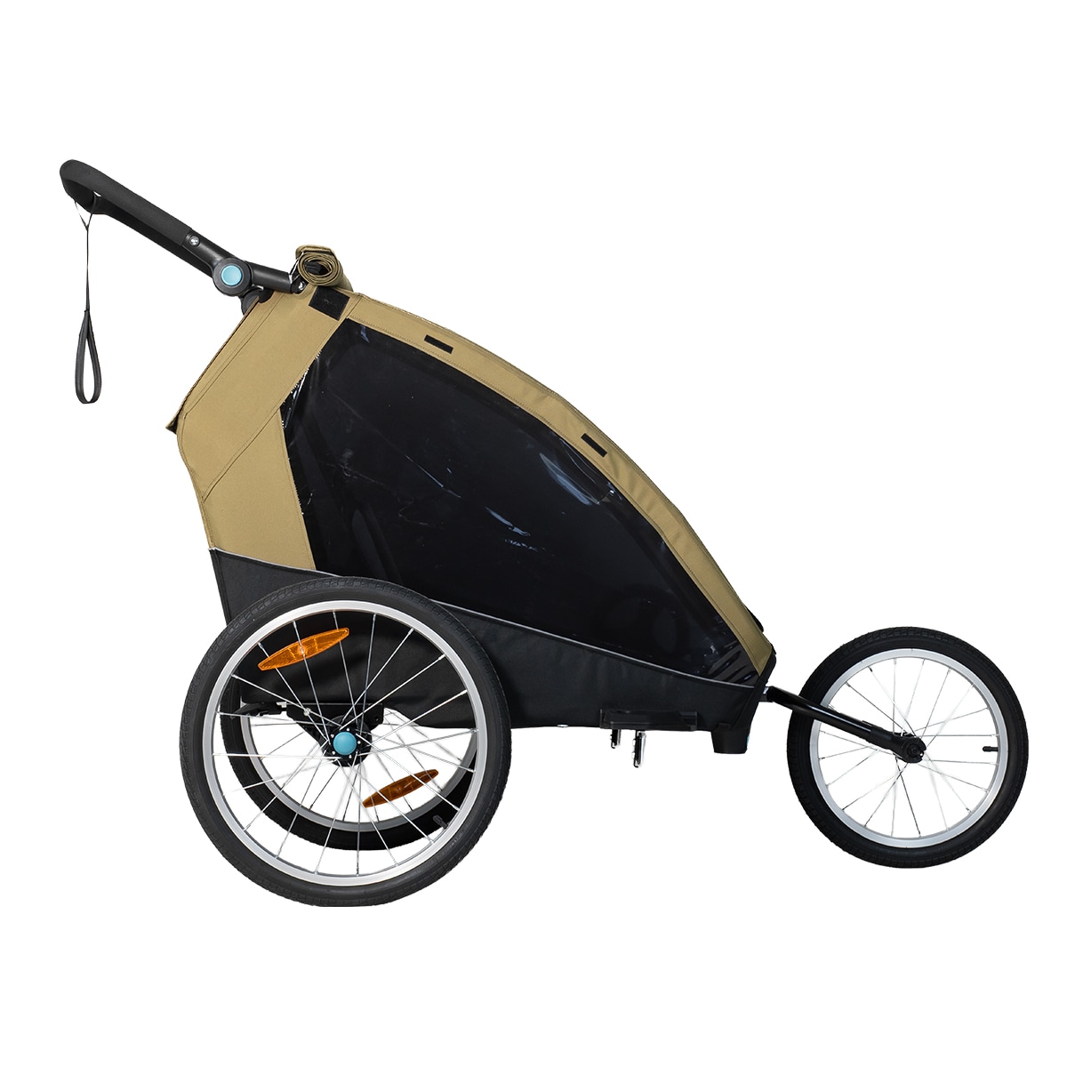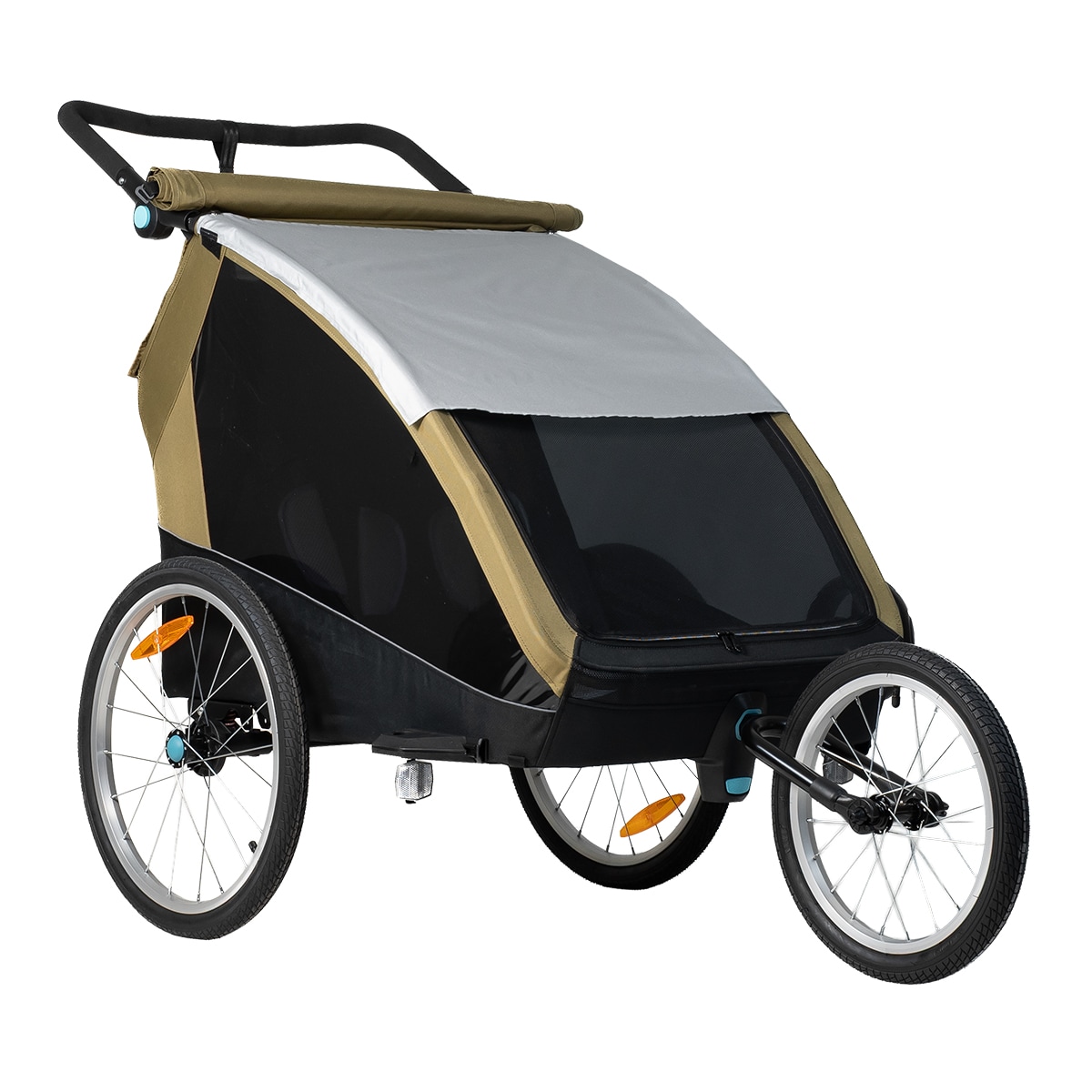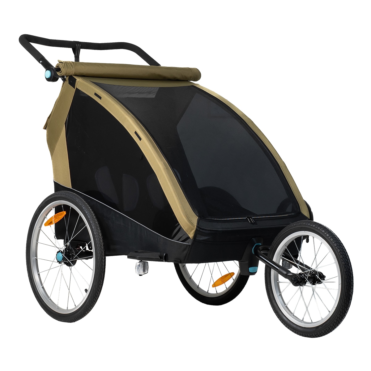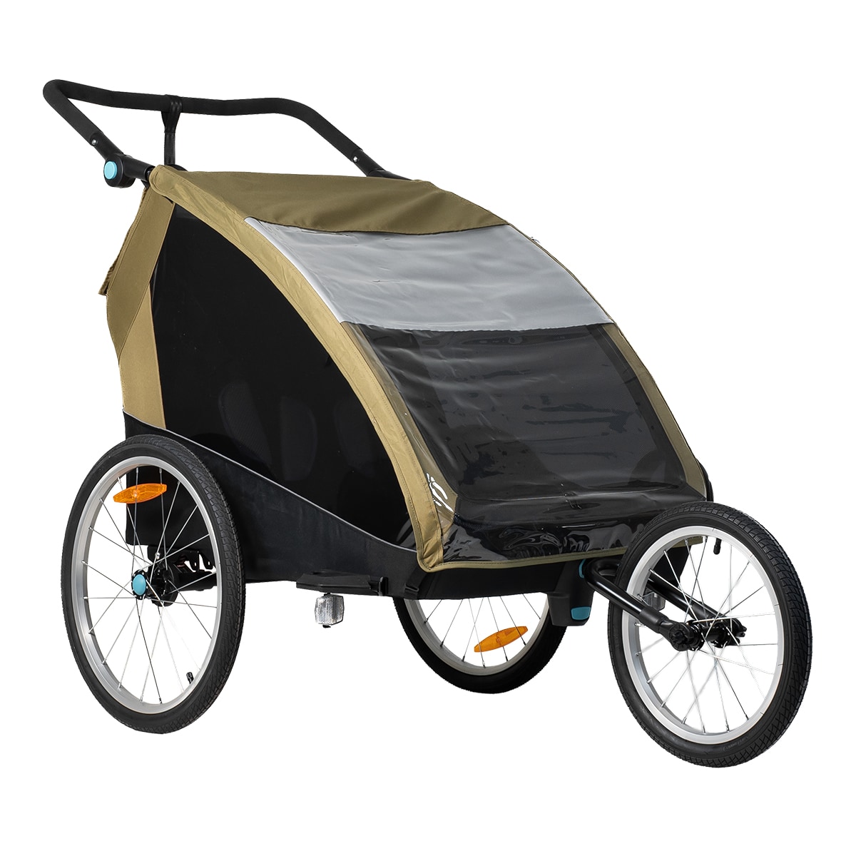 Pyöräkärryssä on runsaasti tilaa kahdelle lapselle, ja se on valmistettu kestävästä 600D Oxford-kankaasta, jonka vesipilari on 5000 mm. Se kestää sadetta ja soveltuu päivittäiseen käyttöön, mutta saumoja ei ole teipattu. Mukana tulee integroitu kaksiosainen tuuli- ja aurinkosuoja, joka voidaan helposti avata aukon päälle. Tuulisuoja on luonnollisesti vettä hylkivä, jos tulee sadekuuro. Harkittu muotoilu luo suojaisan ja mukavan istuinympäristön matkan aikana.