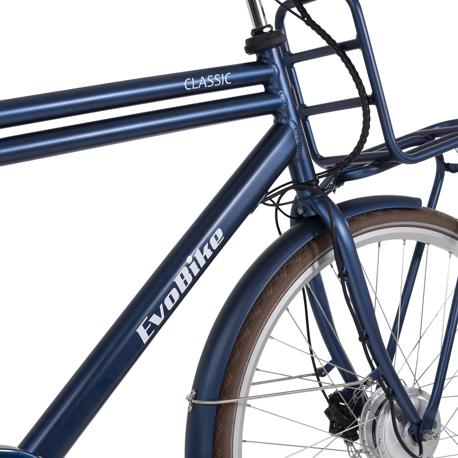Evobike Classic-3 on supermukava ja todellinen kruisailupyörä, jossa on trendikäs muotoilu. Moottori on tunnetun Bafangin valmistama, ja varustettu litiumakku on kapasiteetiltaan 432 Wh (36 V sekä 12 Ah) tai 648 Wh (36 V 18 Ah). Ohjaustangon LCD-paneelin värillisestä näytöstä voit hallita moottorin avustustehoa viidellä tasolla ja tarkastella mm. akun varaustasoa, nopeutta ja matkaa. Lisäksi voit helposti ladata puhelimen näytön USB-portista. Evobike CLASSIC-3 -sähköpyörässä on kolme vaihdetta, jalkajarru takana ja hydraulinen levyjarru edessä.
