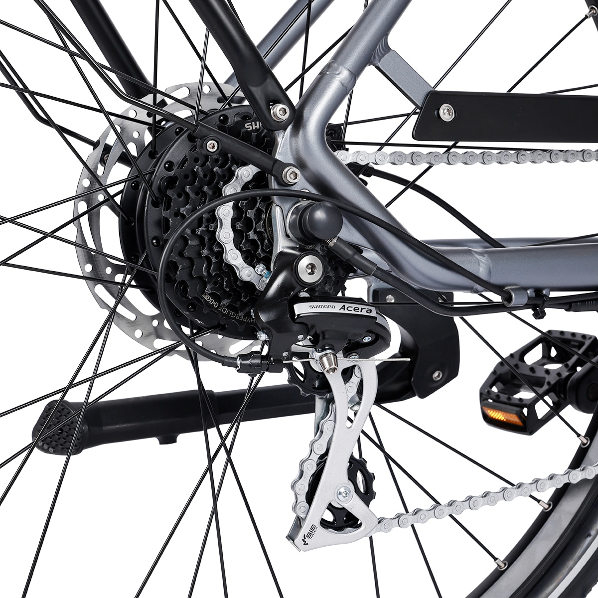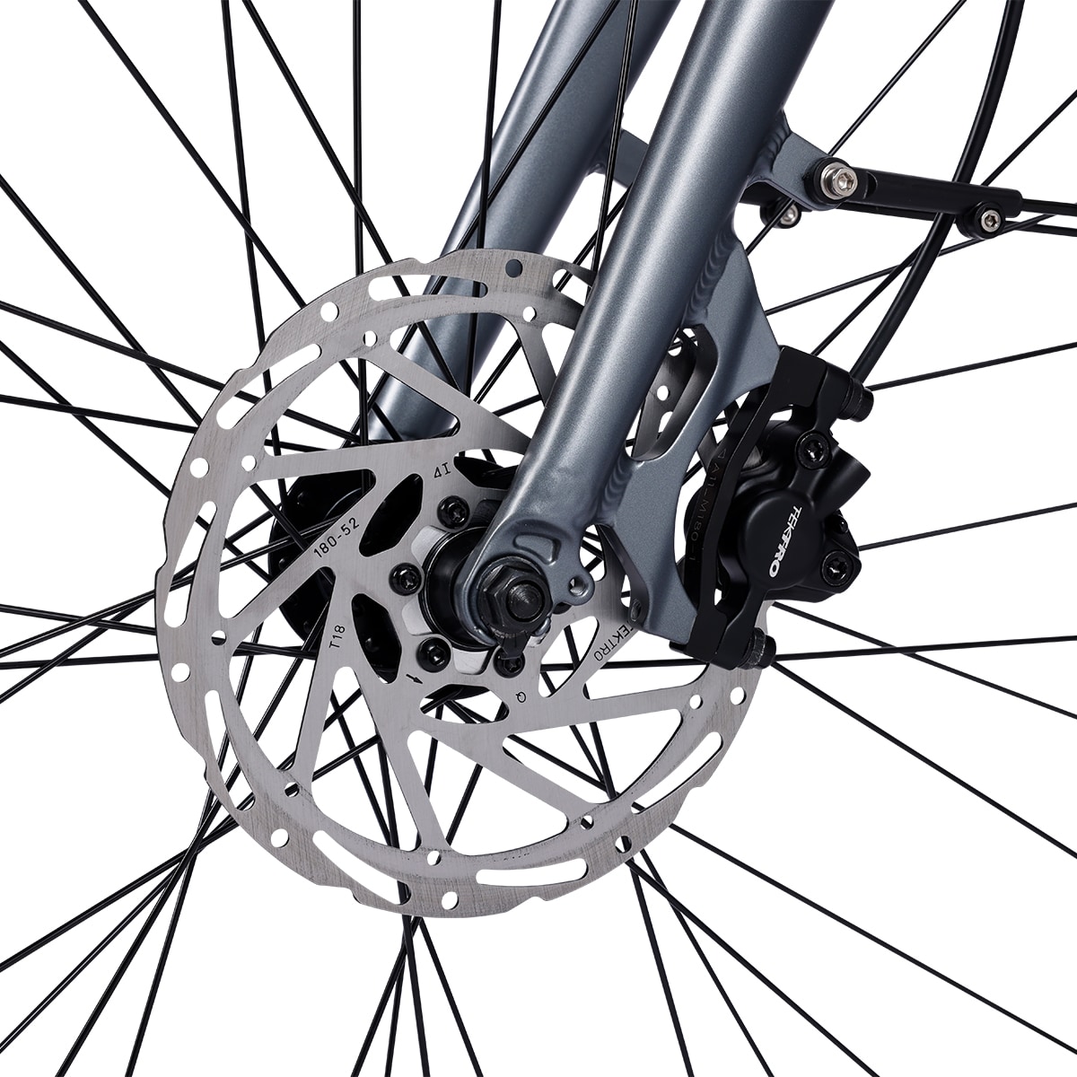 Sport-8 miesten on varustettu Shimano-vaihteistolla, jossa on kahdeksan vaihdetta. Vaihteiden vaihtaminen onnistuu sujuvasti polkiessa ja tarjoaa laajan välitysalueen sekä ylämäkiin että tasaisille osuuksille. Sekä edessä että takana on tehokkaat Tektro-hydrauliset levyjarrut, jotka takaavat hyvän jarrutustehon kaikissa sääolosuhteissa.